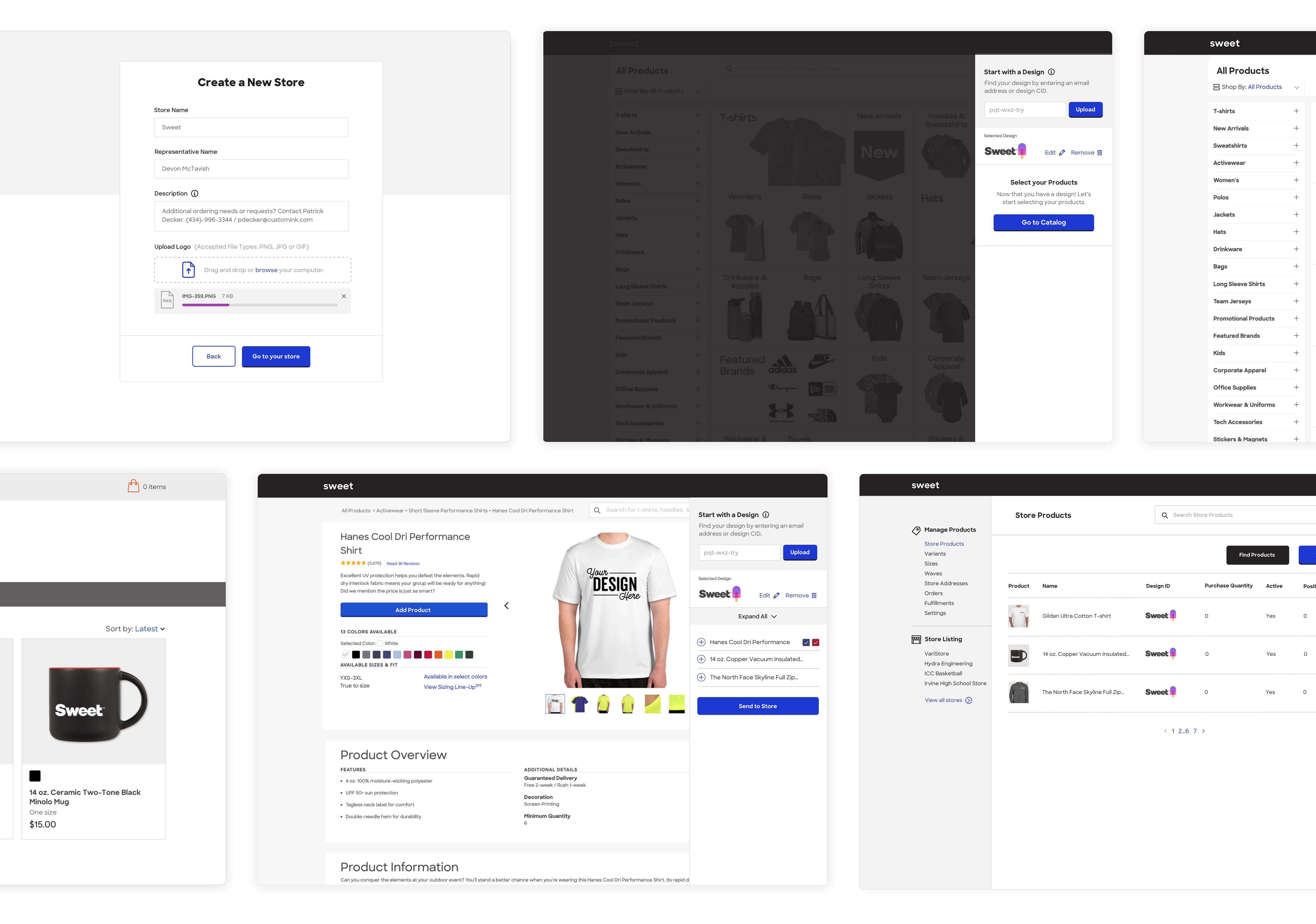 The Online Stores project was new territory for Custom Ink. This was the first time in the history of the business that we would market a new product built from the ground up. We created a series of applications that would enable our sales representatives to demo stores to prospects more efficiently, help location managers organize their deliveries, and supply our buyers with a seamless checkout experience.