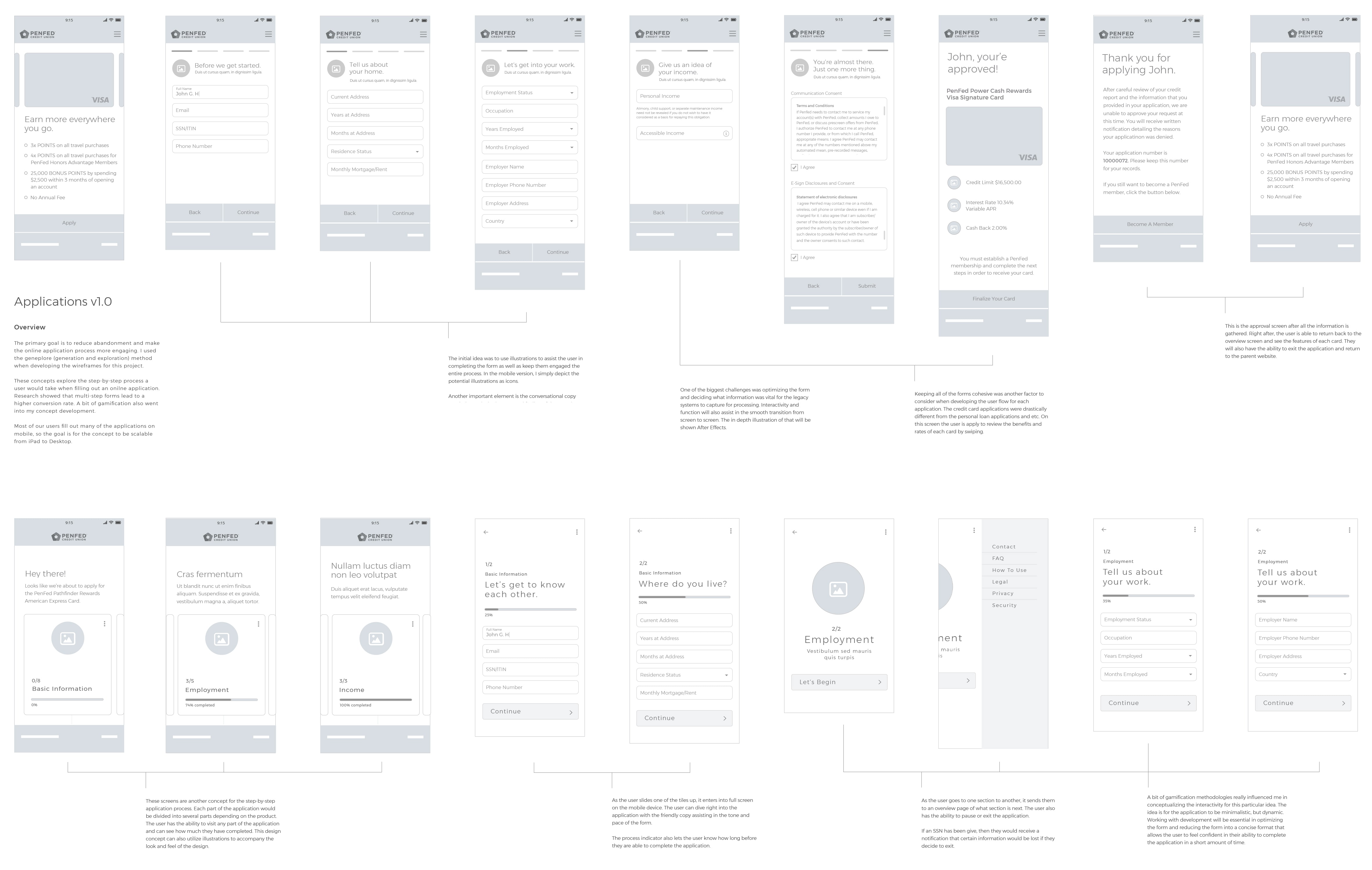 For a week, we conducted several “design thinking” sessions with multiple stakeholders to better understand the pain points that users were having before they chose to abandon the application process. There were 4 major touch-points within the user experience that we wanted to capture: Before the user leaves, user leaving, user re-entry and after the user finishes the application. From there, we incorporated our quantitative research to better synthesize the traditional and modern methodologies used when creating online applications that meet customers needs.